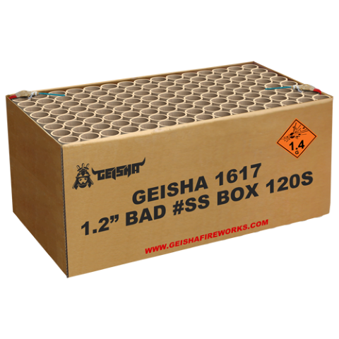 Sechs große Feuerwerksbatterien mit jeweils 20 Schuss in Kaliber 30mm und verschiedenen Effekten, verpackt in einem Sortimentskarton.